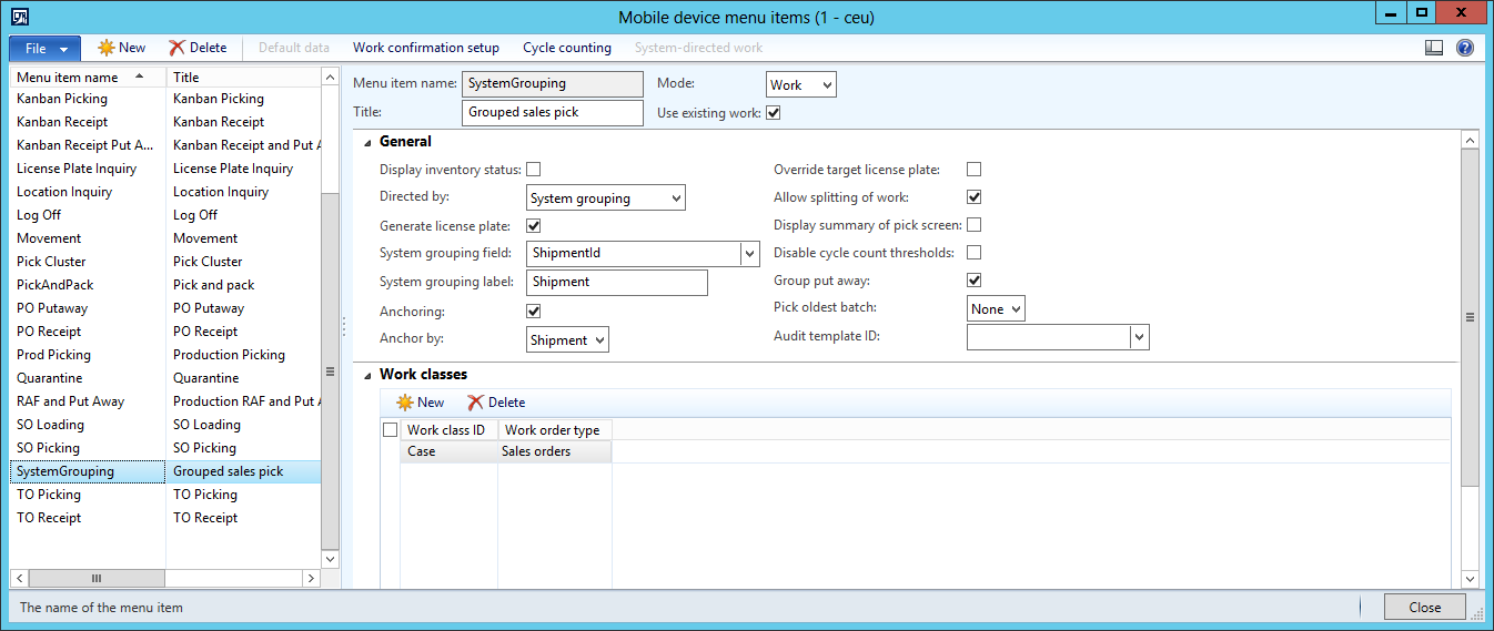 The only difference to the configuration mentioned in the blog post above was the setup of the mobile device menu item. In the current scenario, the Directed by method was set to System group and Grouped by was set to Shipment ID. This was the reason why the work line pick for all the work orders for the shipment was pushed to the mobile device one line after another.