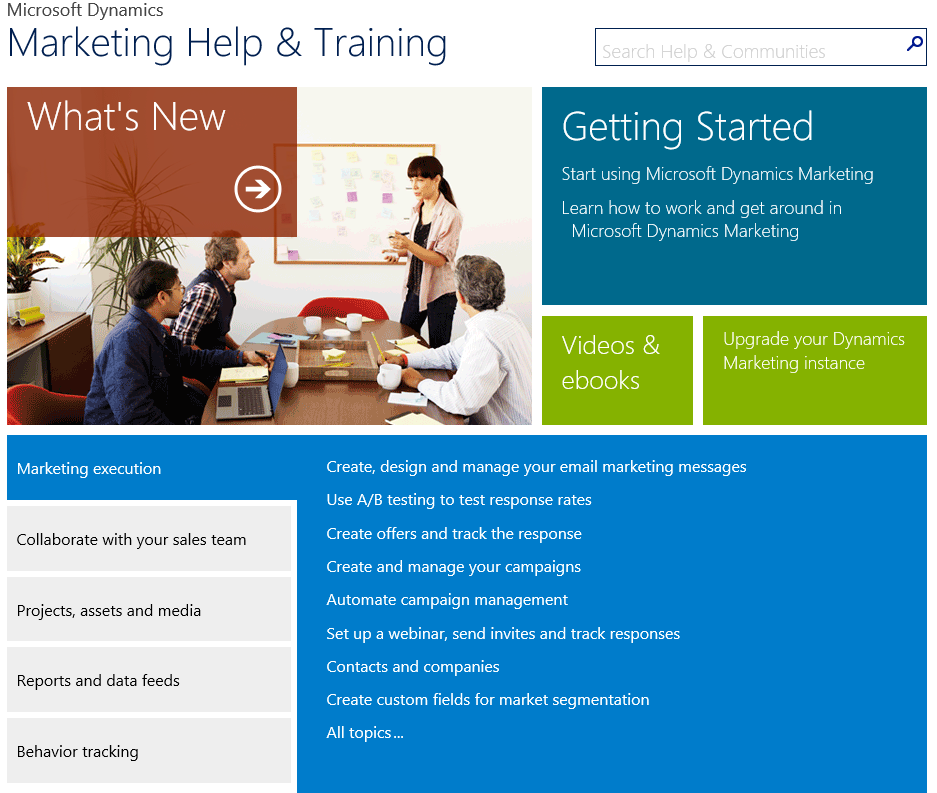 This central information hub gives you access to key Microsoft Dynamics Marketing content sources: