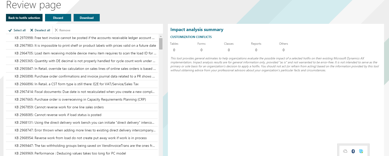 Click Download cart to see the Review page. This page also provides a cumulative view of the impacts from the selected hotfixes on your customizations. You can select and remove updates before downloading an update package.