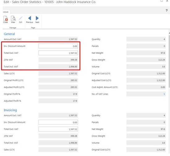 Before Microsoft Dynamics NAV 2015, totals and discount information was scattered between the document and the Statistics page, which made it less discover-able and less usable for new users. It was difficult to see the discount amounts, relate the amounts to the currency of the invoice, and it was not-intuitive that you had to update the Statistics page to see updates on the document. In addition, the result of the update was not visible on the main document, which added to the confusion.