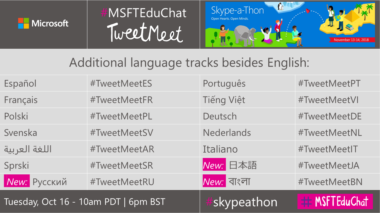 Join us Tuesday, October 16 from 10 a.m. to 11 a.m. PDT on Twitter using the hashtags #MSFTEduChat, #skypeathon, #globaled and #MicrosoftEDU (which you can always use to stay in touch with us). To find the event time for your specific location, use this time zone announcer.