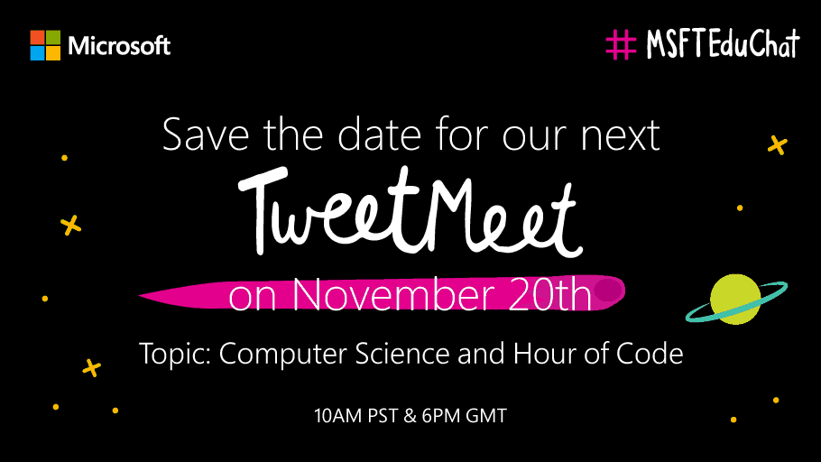 TweetMeets are monthly recurring Twitter conversations about themes relevant to educators, facilitated by Microsoft Education. The purpose of these events is to help professionals in education to learn from each other and inspire their students while they are preparing for their future. The TweetMeets also nurture personal learning networks among educators from across the globe.