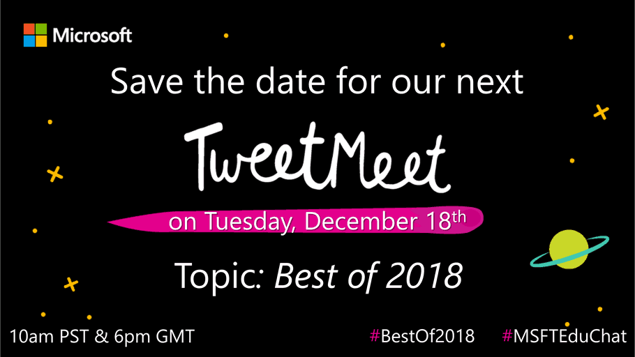 TweetMeets are monthly recurring Twitter conversations about themes relevant to educators, facilitated by Microsoft Education. The purpose of these events is to help professionals in education to learn from each other and inspire their students while they are preparing for their future. The TweetMeets also nurture personal learning networks among educators from across the globe.