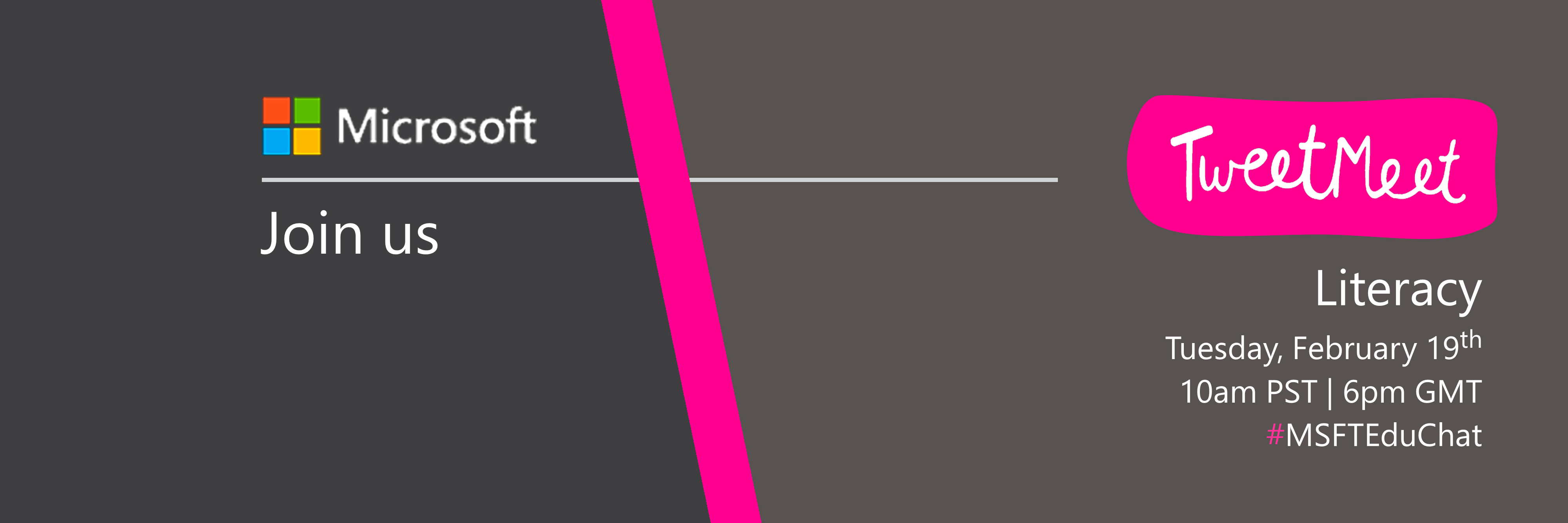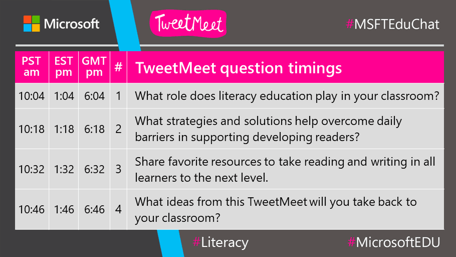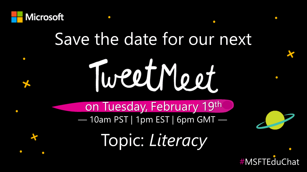 Join us Tuesday, February 19 from 10 a.m. to 11 a.m. PST on Twitter using the hashtags #MSFTEduChat, #Literacy and #MicrosoftEDU (which you can always use to stay in touch with us). To find the event time for your specific location, use this time zone announcer.
