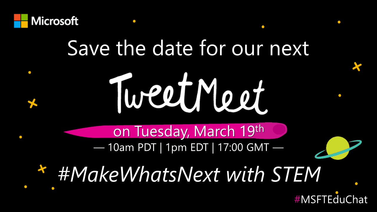 The #MSFTEduChat TweetMeet will take place on Tuesday, February 19th, at 10:00 a.m. PST (check your time zone here). (Sounds great, but what’s a TweetMeet?)