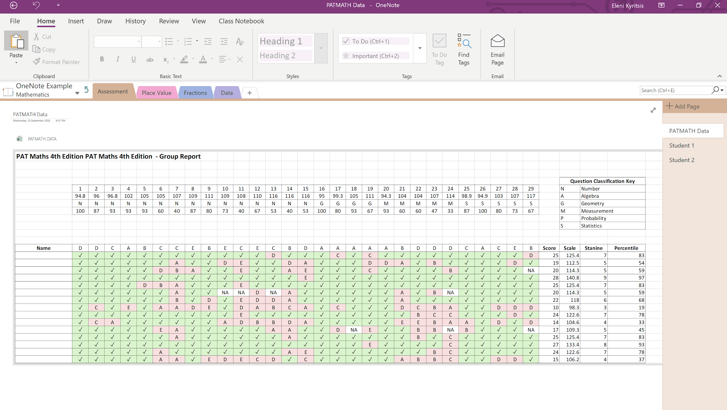 OneNote’s “Sections” and “Pages” features ensure I stay highly organised and manage all my students’ results and work samples throughout the entire school year. A “Section” is like a folder, and within each folder, you can have as many “Pages” as you require. At the beginning of each school year I set up my OneNote notebook like this: