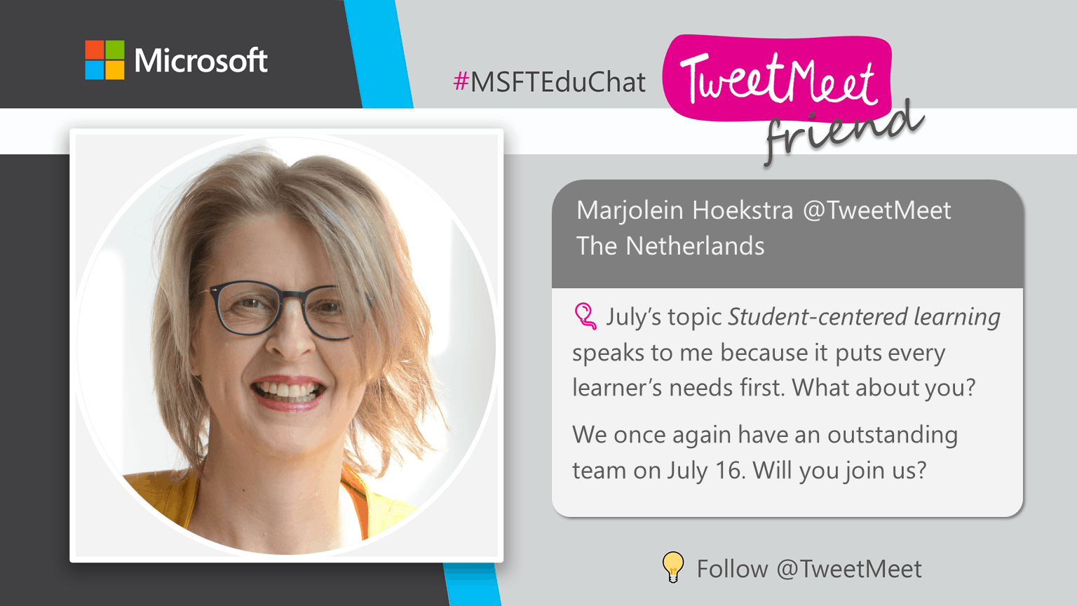 TweetMeets are monthly recurring Twitter conversations about themes relevant to educators, facilitated by Microsoft Education. The purpose of these events is to help professionals in education to learn from each other and inspire their students while they are preparing for their future. The TweetMeets also nurture personal learning networks among educators from across the globe.