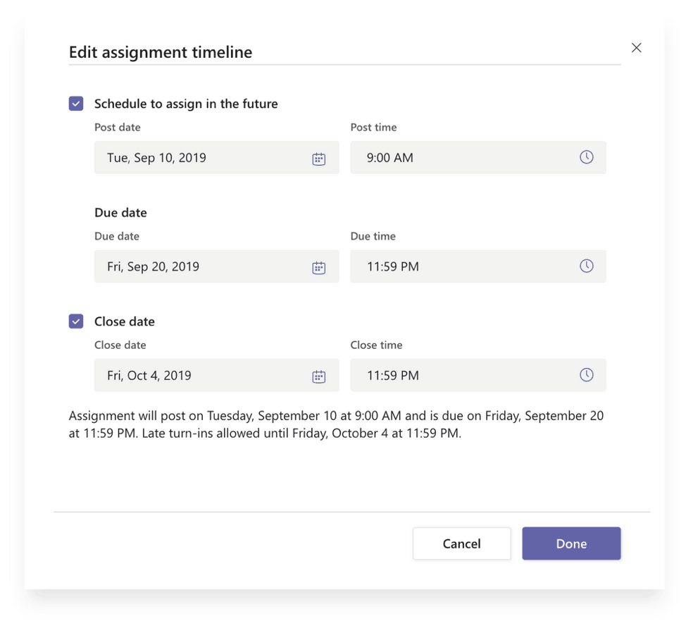 - Set a Close Date. Edit all the dates that matter to your assignment with new, more fine-tuned controls. Schedule to assign in the future, add a due date, and now, specify when you want to close turn-ins, too. No submissions will be allowed after the close date, granting you more flexibility on if/when you’ll accept late or revised work from students.