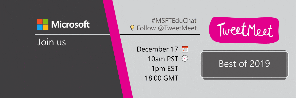 Join us Tuesday, December 17 from 10:00 a.m. to 11:15 a.m. PST on Twitter using the hashtags #BestOf2019, #MSFTEduChat and #MicrosoftEDU. Be sure to double-check your own local event time. You can find the event time for 215 countries with this time zone announcer.