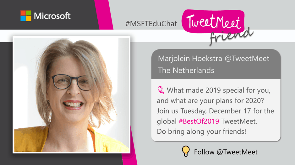 TweetMeets are monthly recurring Twitter conversations about themes relevant to educators, facilitated by Microsoft Education. The purpose of these events is to help professionals in education to learn from each other and inspire their students while they are preparing for their future. The TweetMeets also nurture personal learning networks among educators from across the globe.