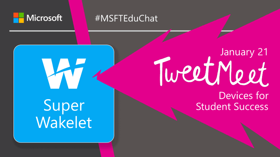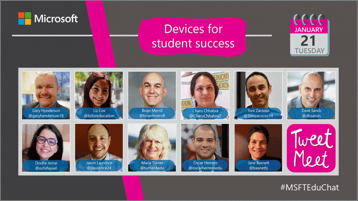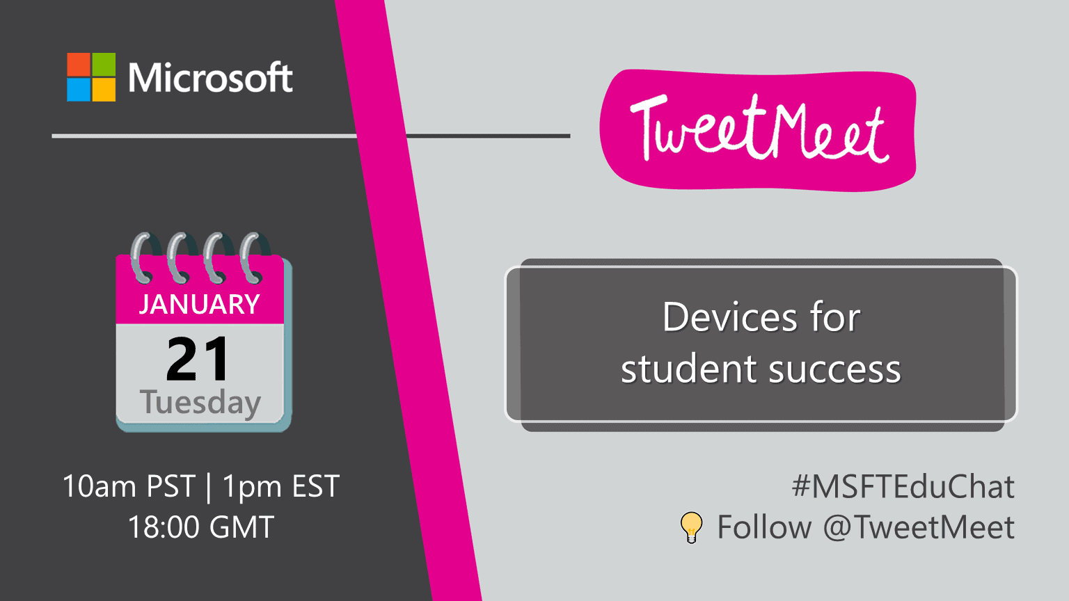 Join us Tuesday, January 21 from 10:00 a.m. to 11:15 a.m. PST on Twitter using the hashtags #StudentSuccess, #MSFTEduChat, #TweetMeetEN and#MicrosoftEDU. Be sure to double-check your own local event time. You can find the event time for 215 countries with this time zone announcer.