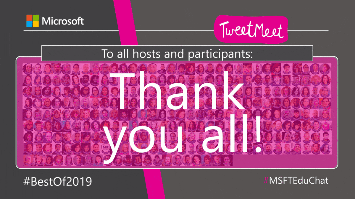 For last month’s special-edition TweetMeet we invited all #MSFTEduChat hosts from past years to come back another time, to commemorate and celebrate all the wonderful experiences of the past year with you. The TweetMeet was a tremendous success, with many hundreds of participants and thousands of tweets, as you can see in the Thank You animated GIF below.