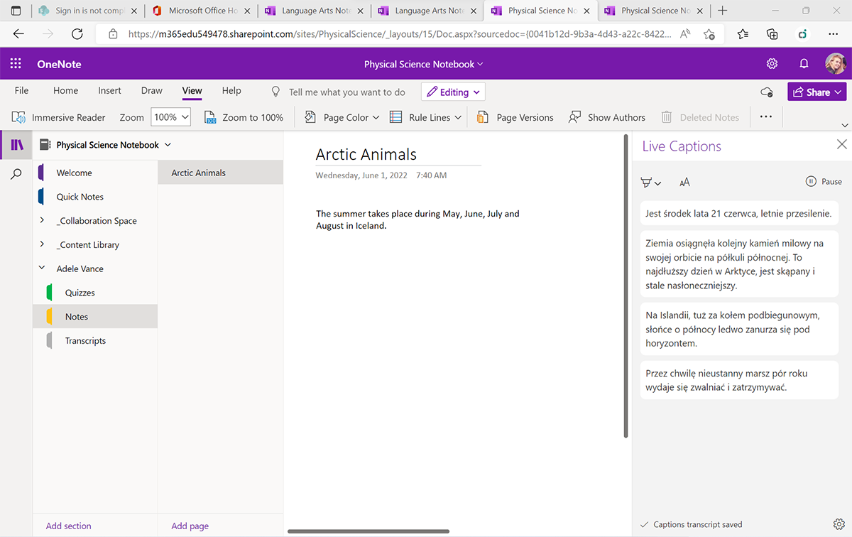 Live Captions in OneNote initiates a “conversation” and then through a shared code, students can enable automatic translation. Everything said in class is transcribed in the student’s notebook in whatever language they choose, and students can simultaneously take notes or draw right on the same page and learn in the way that best suits them.