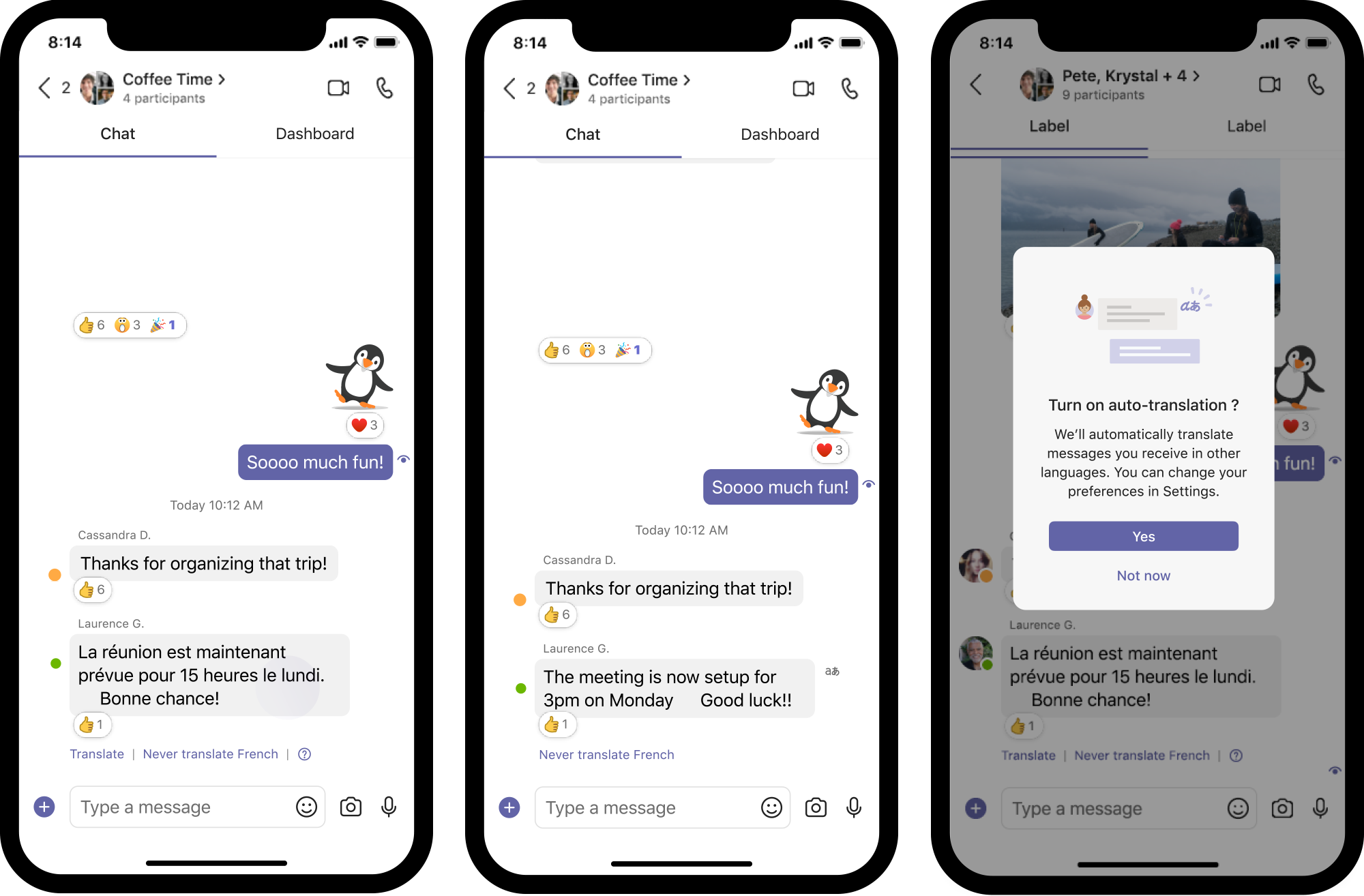 Intelligent Chat translation in Teams iOS/Android detects the language of the chat message and offers translation suggestions to translate the message to the user’s preferred language. Microsoft Teams also prompts users to “turn-on automatic translation” and have all the messages automatically translated to their preferred language. With this feature, students and parents can confidently collaborate with teachers and other students in their preferred language and be assured that the recipient can understand them.