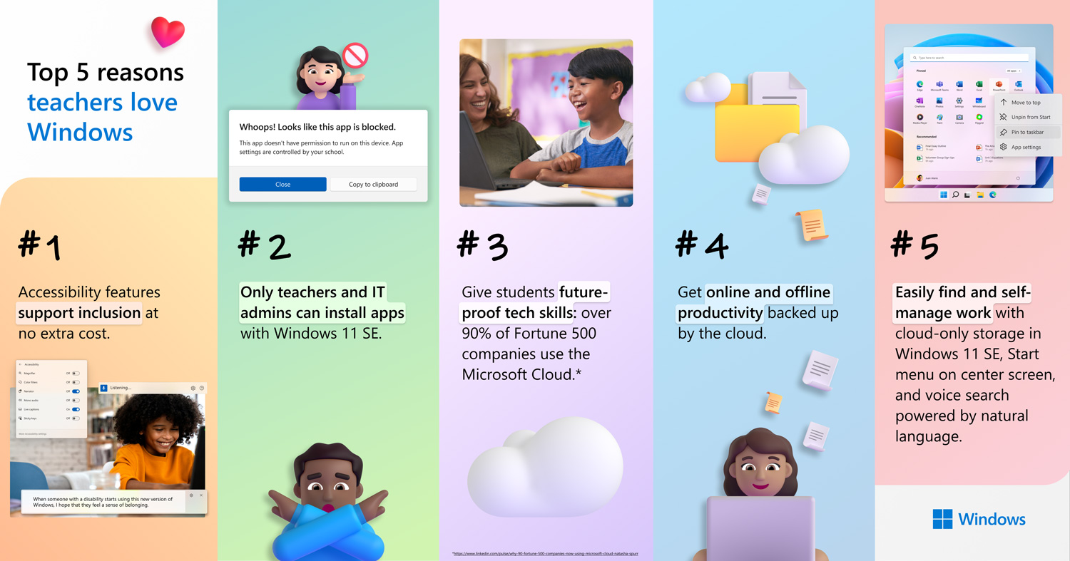 To better support today’s educators, Microsoft reimagined the Windows platform to help them unlock the full potential of every student with safe and engaging student-centered technology that prioritizes equity and accessibility. The new Windows 11 for Education provide a simple, accessible environment on devices that are secure, easy to deploy and manage, and perform well across the changing conditions of a school year.