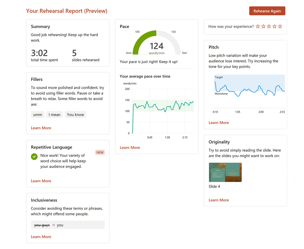 Rehearsal report summarizes your performance and provides actionable feedback