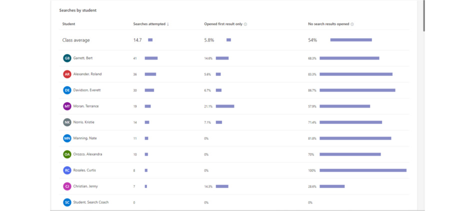 Additionally, to support educators in tracking student progress and learning around information literacy, Search Coach provides actionable insights into student searches through Education Insights in Microsoft Teams for Education. These insights can help educators make thinking visible by showing exactly how students construct queries and gather sources. Educators have access to a variety of data including which students opened only the first result after a search and how many search attempts were made. They are also able to analyze common search terms and patterns across an entire class, informing individual, small group, and whole class learning.