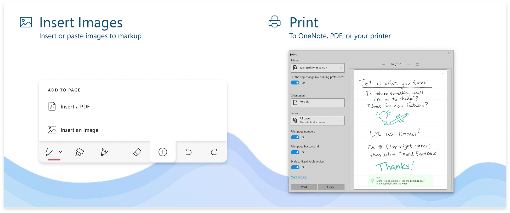- Print and Export You can now print and export your journal pages to a printer, a PDF, or to OneNote. From the page menu or the navigation panel you can select what to include