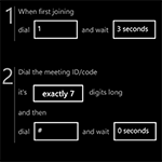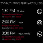Join via voice by speaking to Cortana “JOIN MY CONFERENCE”. We’ll automatically figure out which meeting is about to start and what conference system it uses, then connect you in the right way. Join Conference should work with all conference systems, whatever your company might use. For most systems, it dials the appropriate phone number, ID, and PIN touch tones. For Lync and GoToMeeting conferences it launches the associated app to join.