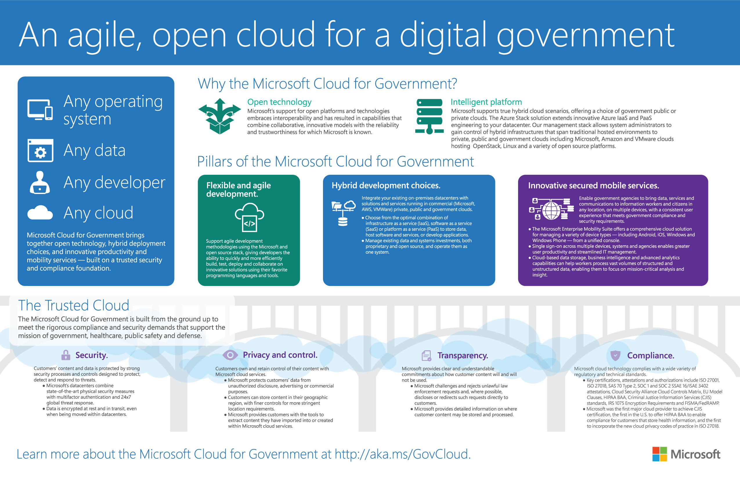 Microsoft’s goal is to enable seamless, effective management of government agencies’ information, applications and software, across any operating system, any data, any developer and any cloud. The Microsoft Cloud for Government brings together open technology, true hybrid deployment choices, and advanced productivity and mobility services-all built on a solid foundation that is trusted, more secure and compliant.