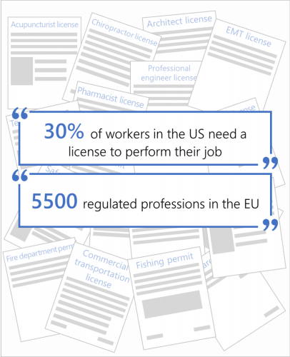 A large percentage of today’s workforce has to endure the slow process of applying for and receiving a license or permit. Today, 30% of US workers need some sort of occupational license, which is 25% higher than the 1950s[i]. A similar trend exists in the European Union – roughly 5,500 professions need a license to practice[ii]. In both cases, the process of getting a license is painfully manual. Professionals have to identify the right forms, fill in the information, drop them off in person and then…wait. While waiting, it’s impossible for applicants to know if they forgot a key piece of documentation which could result in delay or rejection.