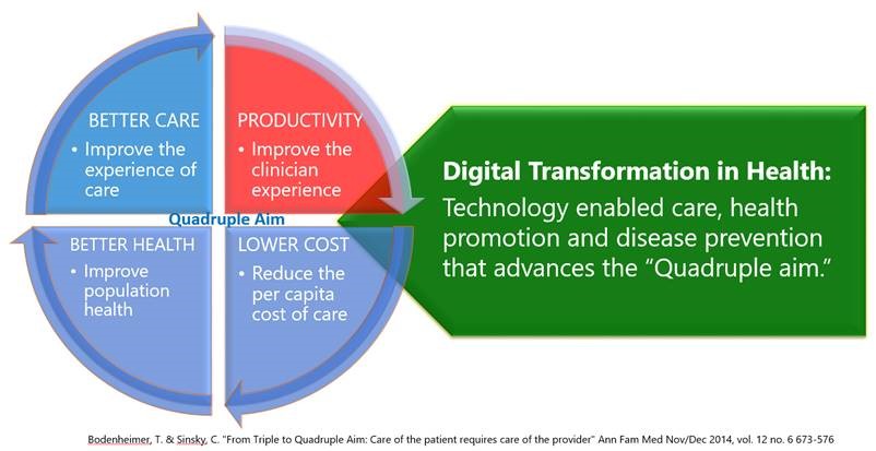 At Microsoft our medical experts including Dr. Simon Kos, our WW Health Chief Medical Officer, and Dr. Dennis Schmuland, U.S. Chief Health Strategy Officer, work diligently to ensure that we’re fully aligned with healthcare’s digital transformation and “Quadruple Aim” objectives – (1) better care, (2) better health, (3) lower cost, and (4) caregiver productivity. (see graphic “Quadruple Aim”.