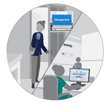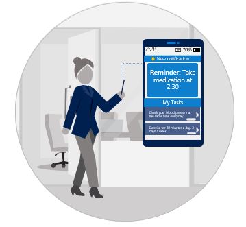 Running between back-to-back client meetings, Julia receives a notification from her mobile app to take her medication. She stops in the hallway to take her blood pressure medicine and marks the task as complete. With that out of the way, she heads into her next meeting, while the patient engagement solution notes the completed task for Susie’s review.