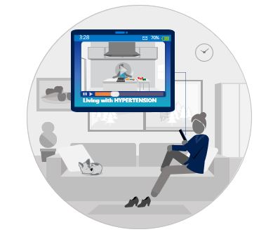 Julia watches curated videos in the app and reads content to teach her about successfully managing her condition. She also receives notifications that remind her to exercise and prepare her meals, which she tracks in the app when complete.
