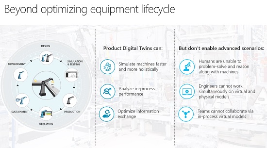 However, there are limitations in terms of what traditional Digital Twins can achieve. For example, manufacturers can work on either the virtual model or the physical models but not on both simultaneously. Traditional systems severely limit the ability to collaborate across the virtual environment while in operation. And, while Digital Twins do extend predictive capabilities, as a stand-alone, they don’t support advanced reasoning alongside humans.