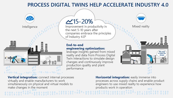 There are several benefits that make the Process Digital Twin such a valuable strategy to accelerate Industry 4.0. For example, you can better integrate internal operations in your organization and you can more easily collaborate across supply chains that are horizontally integrated in the hologram. In addition, product engineers in one organization can now interact with manufacturing engineers in another organization to not only improve the performance of equipment but also improve the quality of production, hence, creating a more efficient manufacturing operation.