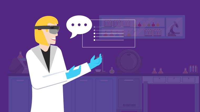 However, Megan is actually using a HoloLens, a wearable device that allows her to interact with a smart bot to troubleshoot and solve problems in real time. The bot gives her access to standard operation procedures and important information to help her follow compliance requirements in the lab without ever having to take her sight off the task at hand.