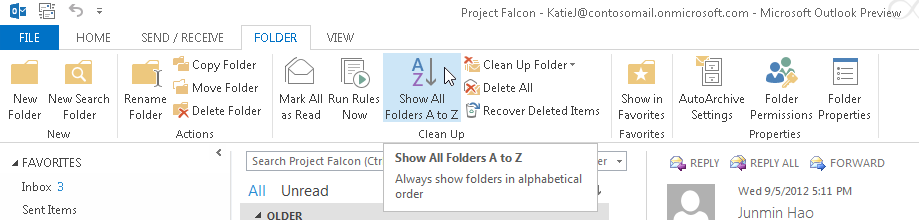 And finally, if you try it out for a while and don’t like it, there’s a button to go back to Outlook 2010 behavior where all folders are always sorted A-Z. Just switch to the Folder tab and turn on the Show All Folders A to Z feature. It will force your folders to be displayed alphabetically, regardless of what order they were in before.
