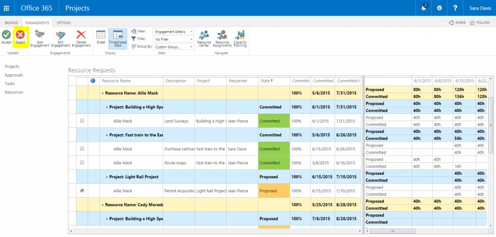 The resource manager (or line manager) is a people manager who may not want to use the full Project client. To allow the resource manager to collaborate with the project manager, Project Online now has an area for the resource manager to view and approve or reject all proposed resource contracts. In addition, the new resource views allow the manager to understand the capacity utilization of their resources at a quick glance.