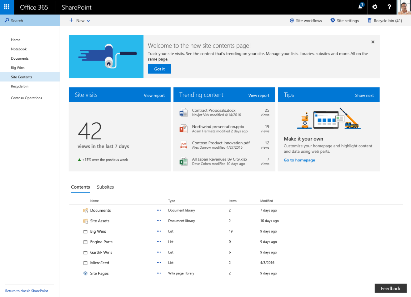 Site activity and insights on the Site Contents page—The SharePoint Online Site Contents page is being redesigned to help site owners, members and visitors understand the activities occurring within the site. The Site Contents page will provide visibility on top-viewed content and a site map, and will offer users site tips. Think of this as site-level activities and analytics. The new Site Contents page will also provide clear access to add lists, document libraries, subsites and apps. New quick buttons will allow access to common actions and deeper site settings.