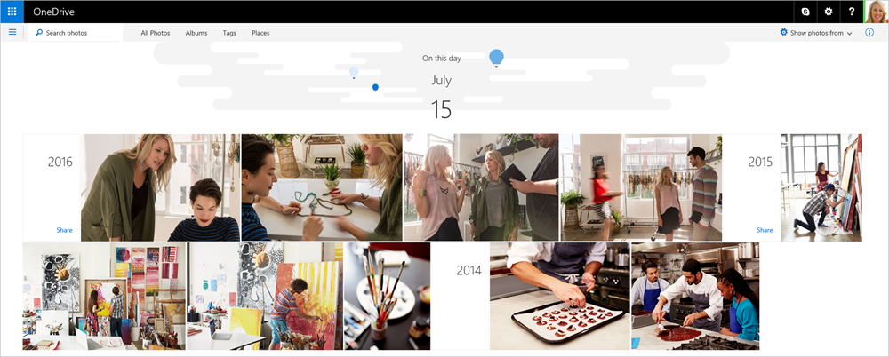 You upload photos to OneDrive so you can easily find and relive memories—whether from another device or by sharing them with friends and family. With automatic albums, this experience is now even easier.