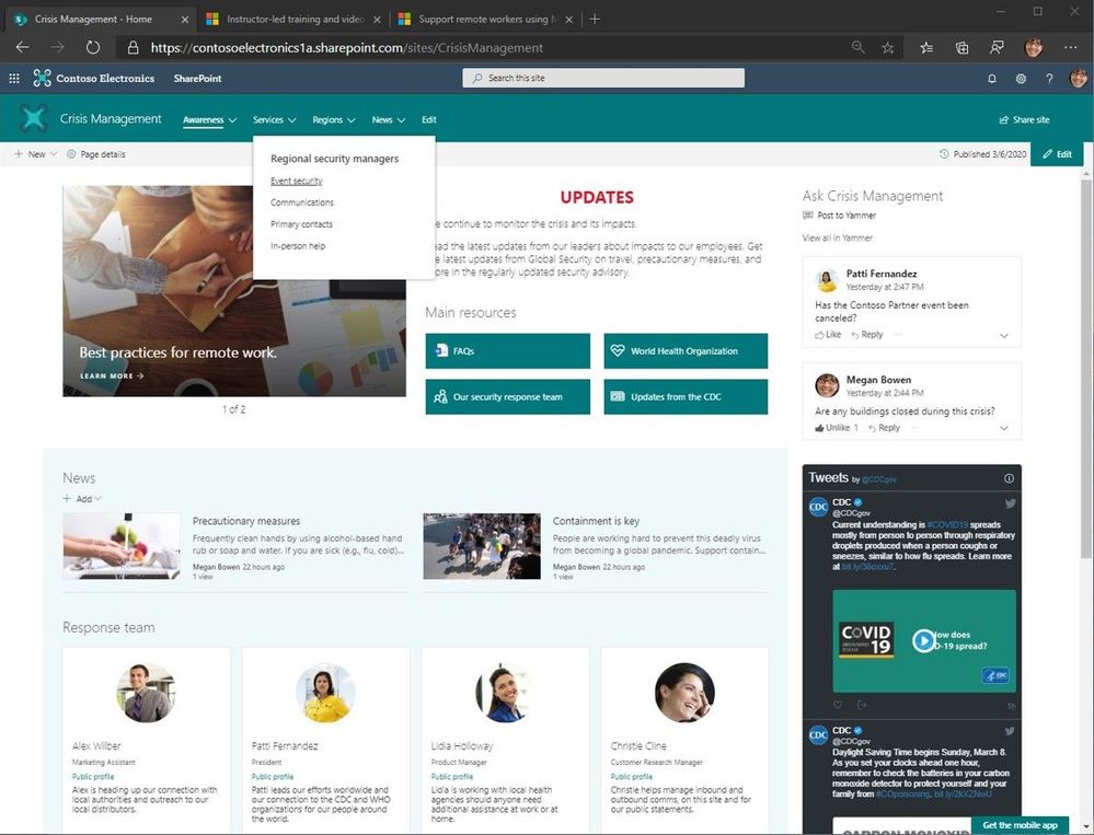 Quickly build an emergency management site to connect people and information—Unexpected events like COVID-19 highlight the importance of establishing and keeping the lines of communication open. A new crisis management site in SharePoint enables your organization to consolidate news, related resources, and topical Q&A in response to emergency events in under two hours. Just head to your SharePoint start page and select Create site > Communication site to start configuring news, links, Q&As, site navigation, highlighted people, and more.
