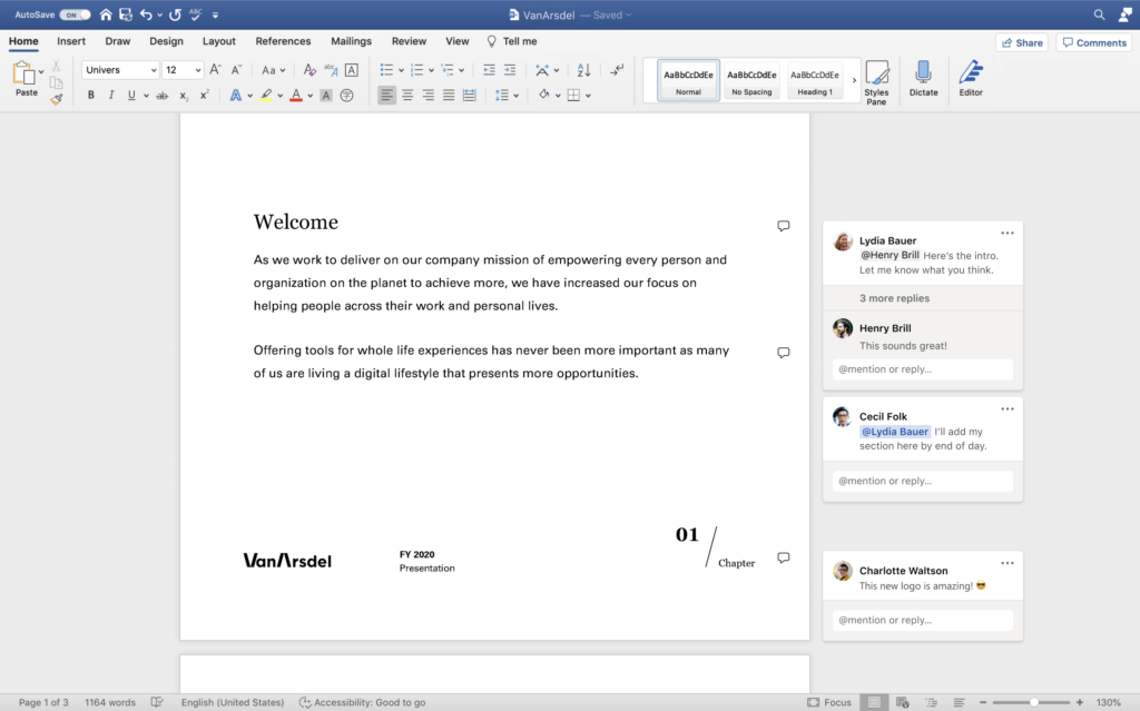 When creating new content as a team, the ability to collaborate around documents and presentations becomes especially valuable when your team is not in the same location. The new modern commenting experience in Word for Mac enables a contextual view of comments that allows you to focus on your content without missing active comments by contributors and reviewers. Modern commenting also includes improved @mentions in PowerPoint and Word for Mac that make it easier to reply to comments. The new @mentions experience is available now in PowerPoint for enterprise customers. Modern commenting for Word is in the Office Insider Beta Channel now and coming to Current Channel Preview in February 2021.