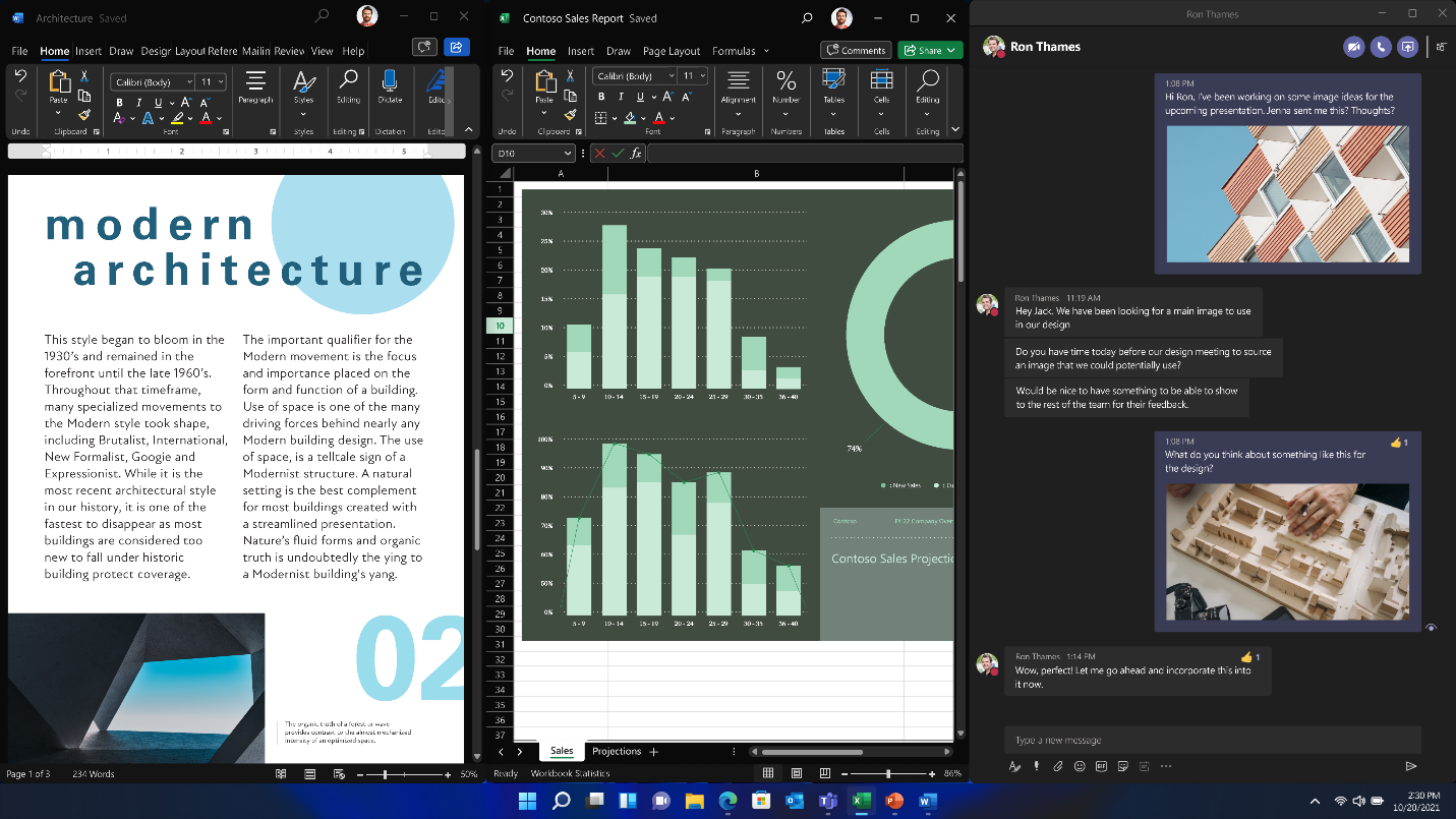 I talked about how, like many of you, I often have several windows open throughout the day as I work on documents, presentations, and spreadsheets. With Windows 11, we focused on improving the way you interact with these windows—how you organize them, snap them to specific areas on the screen, group them together, and toggle back to those snap groups when you need them. In fact, one of my favorite features is that when I undock and re-dock my machine as I move around throughout my day, Windows 11 remembers my snap groups across my screens, saving me time and keeping me in the flow of work.