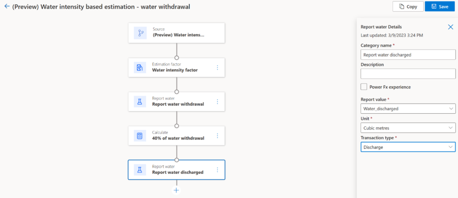 Organizations may not always have measured values for water withdrawal or discharge volumes. Some operate a mix of facilities, some with sensor-connected withdrawals and discharges and some without, and some organizations are newer to instrumenting their facilities to measure water quantities. In these cases, the water intensity feature in Microsoft Sustainability Manager can be used to estimate water volumes—for example, to estimate gallons of water used per square foot—to gain an understanding of overall water inflow and outflow that’s needed to make progress on goals.