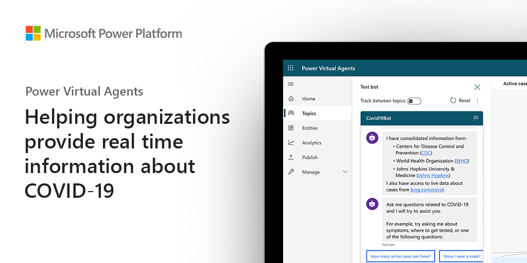 Tips and guides Apr 27, 2020 3 min read Helping organizations provide real time information about COVID-19 with Microsoft Power Virtual Agents