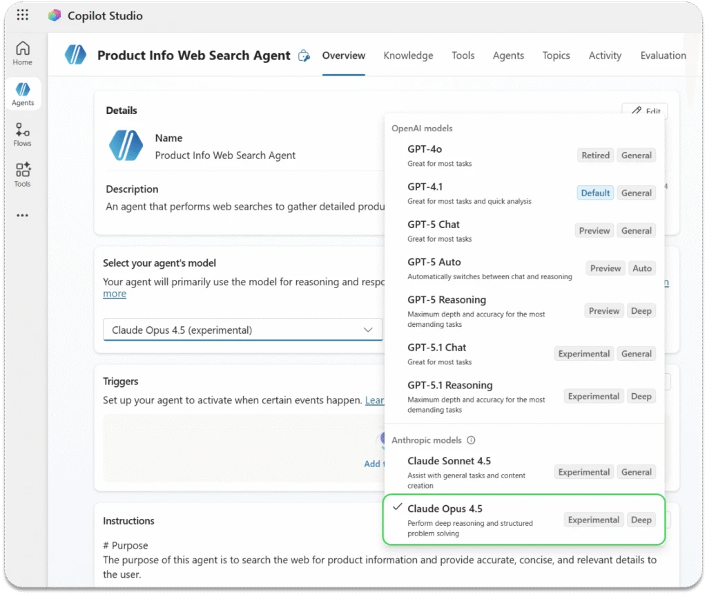 Claude Opus 4.5 will replace Claude Opus 4.1 in Copilot Studio as an experimental model. As with any experimental model, we encourage testing it in non-production scenarios. To use Anthropic models in Copilot Studio, admins must opt in via the Microsoft 365 Admin Center. You can learn more about doing so here. If you have already opted into using Anthropic models in your tenant, there’s no action required.