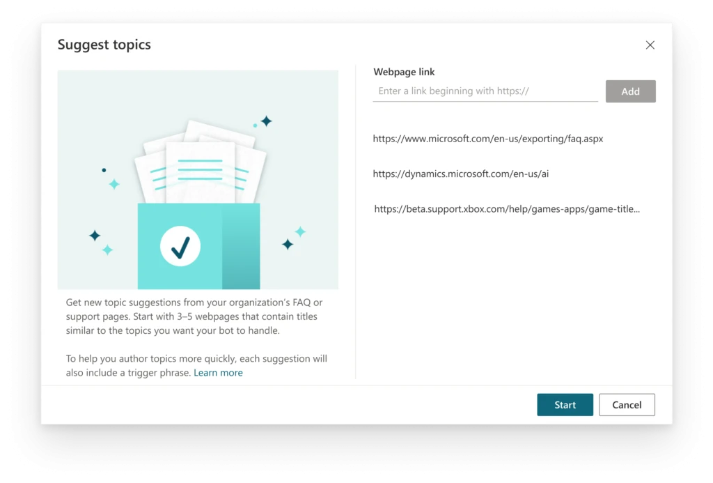 With the AI-assisted authoring capabilities in Power Virtual Agents, it’s easy to leverage your existing web content and integrate it into your bot experience.