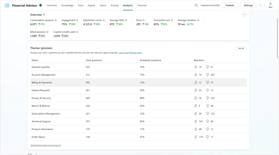 Copilot Studio now surfaces themes for unanswered generative AI questions directly in the Analytics dashboard. Makers can quickly spot patterns in what users are asking but not getting answers for, helping them prioritize knowledge updates and reduce coverage gaps with less manual review.