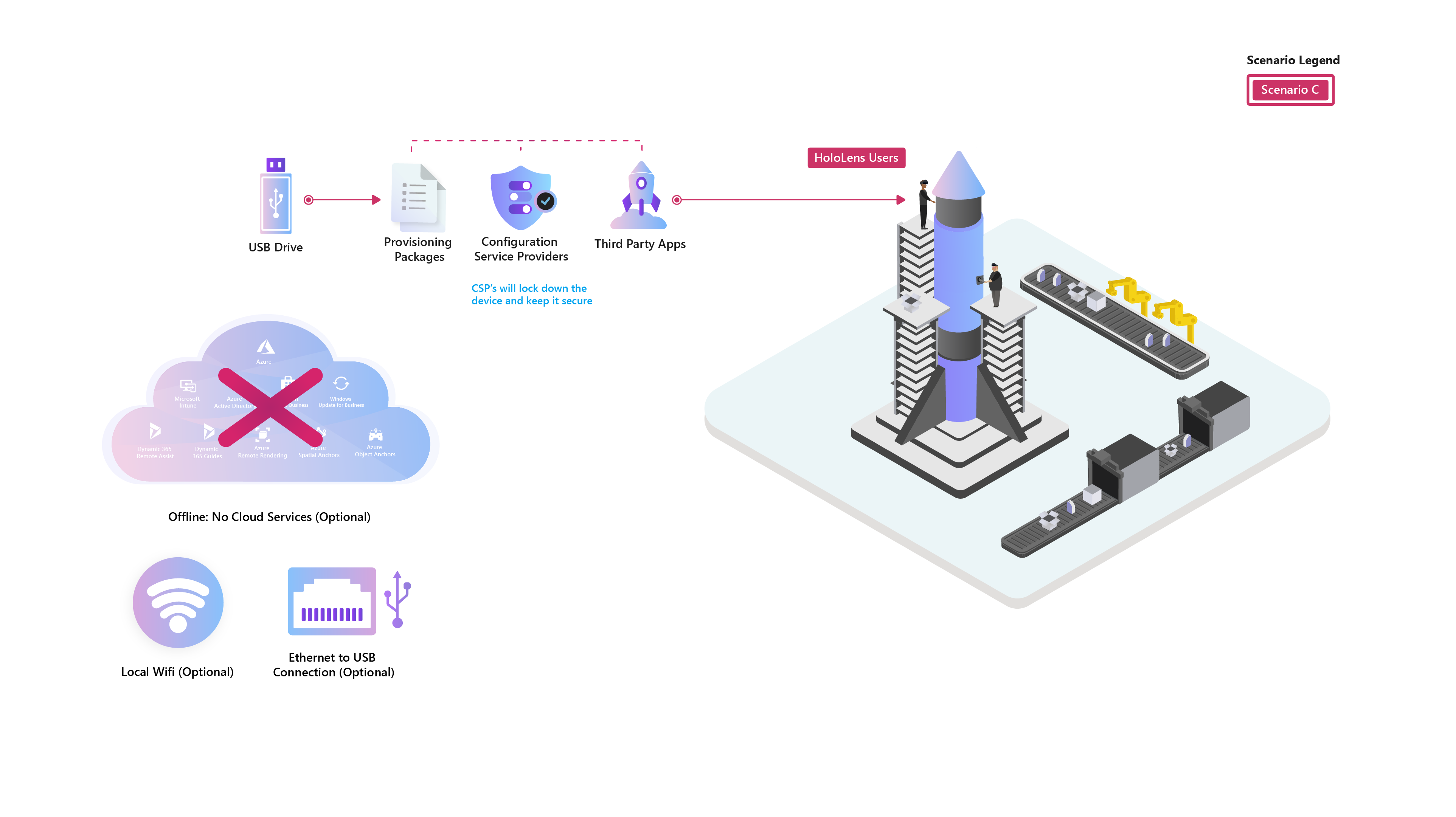 Scenario C: Offline secure environment Some mission-critical processes or some corporate policies may demand the use of offline environments. Devices will be connected to a highly restrictive network or will be purely offline devices. Most suitable for highly secure environments, or internet connectivity restrictions in remote areas.