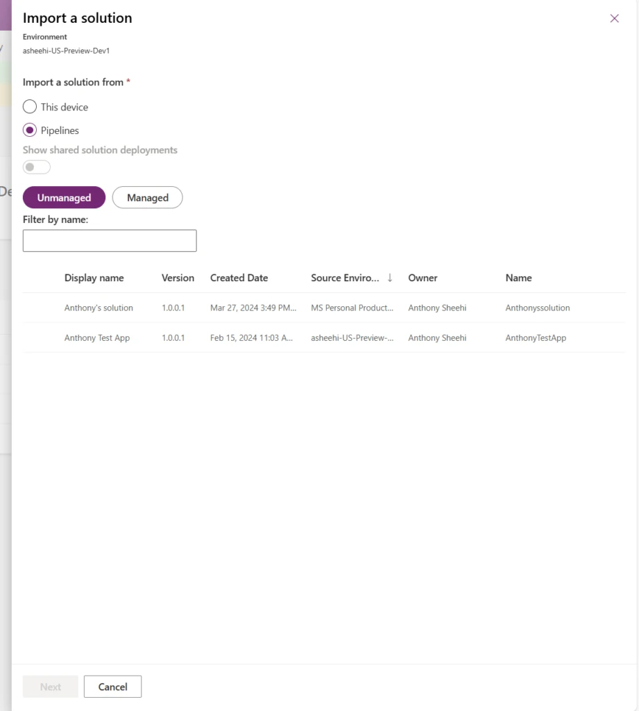 Need to hydrate a development environment with a solution that you’ve deployed via Pipelines in the past? Or maybe you’re an admin and one of your makers left the organization along with their personal dev environment? Now, you don’t have to look for the solution manually or upload a .zip file! All solutions deployed through pipelines are now easily accessible in the solution import experience.