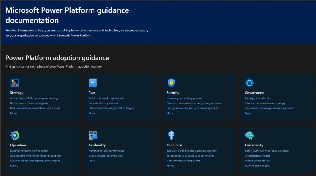 The newly refreshed Adoption Guidance site includes other resources as well. Real-world case studies, toolkits documentation, and white papers aim to help you be successful with Power Platform.