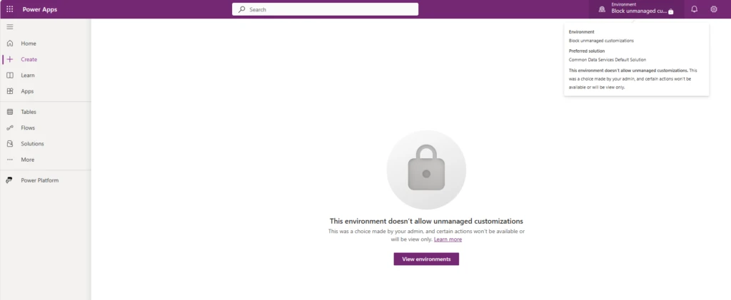 • Any unmanaged customizations changes result in an error returned to the user, such as: “This environment doesn’t allow unmanaged customizations. This was a choice made by your admin, and certain actions won’t be available or will be view only.”