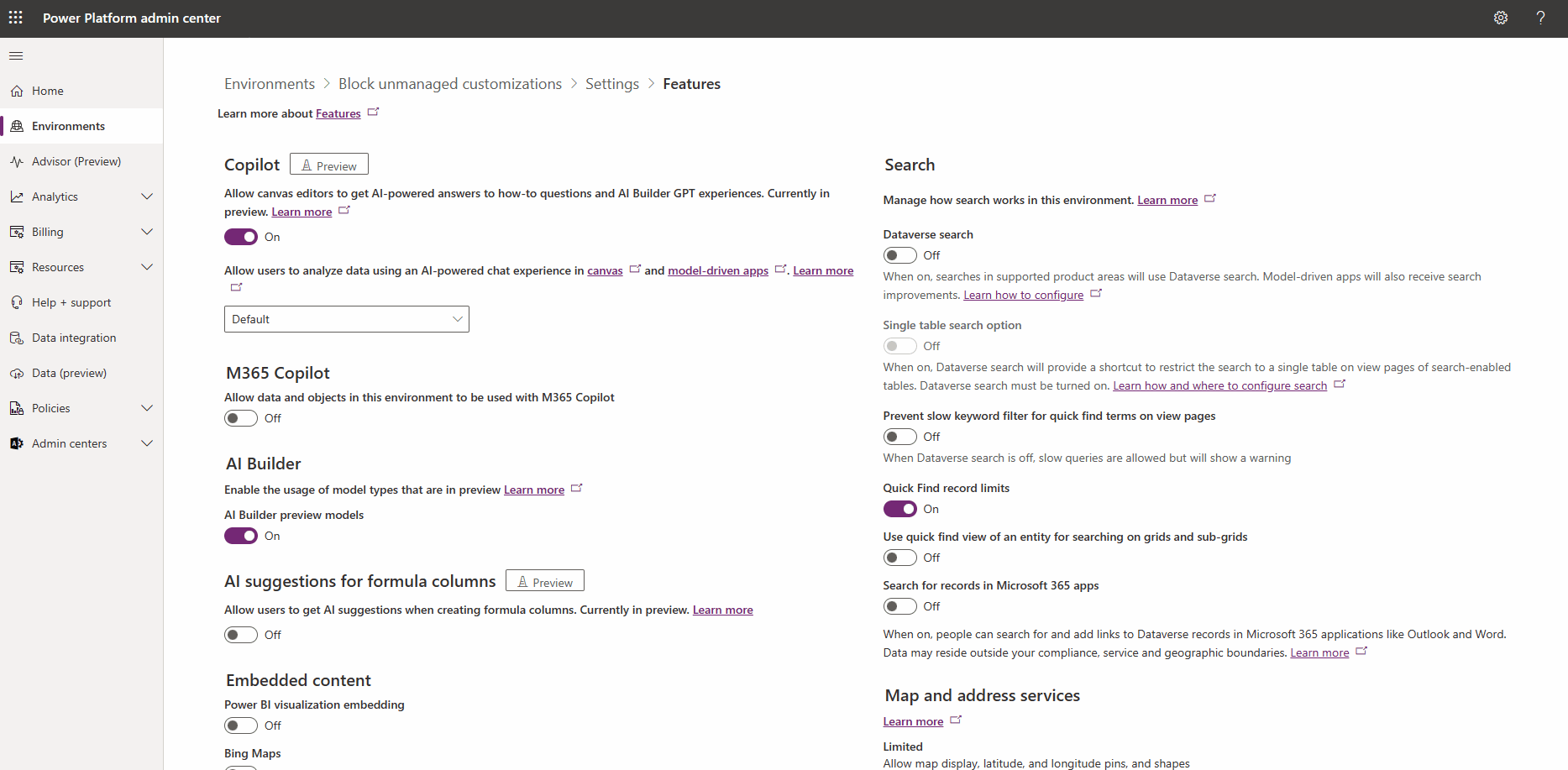 The feature Block unmanaged customizations (Preview) can be enabled or disabled from the Features area of the environment settings for environments in the Power Platform admin center. By default, this setting is disabled.