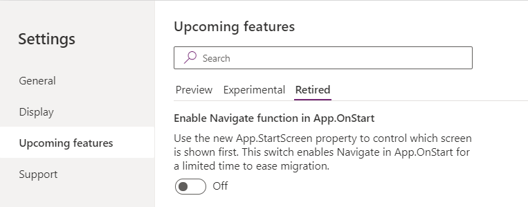 Here’s the exception mentioned before. If you had an existing app created before March 2021, that did not have a Navigate call in App.OnStart, to which you added Navigate to the OnStart between March and now, then the above switch will be turned off and you will see an error the next time you load the app in Studio. Please turn the above switch on to clear the error. We have a fix for this case that will be rolling out soon, but it will be a few weeks until it is fully deployed.
