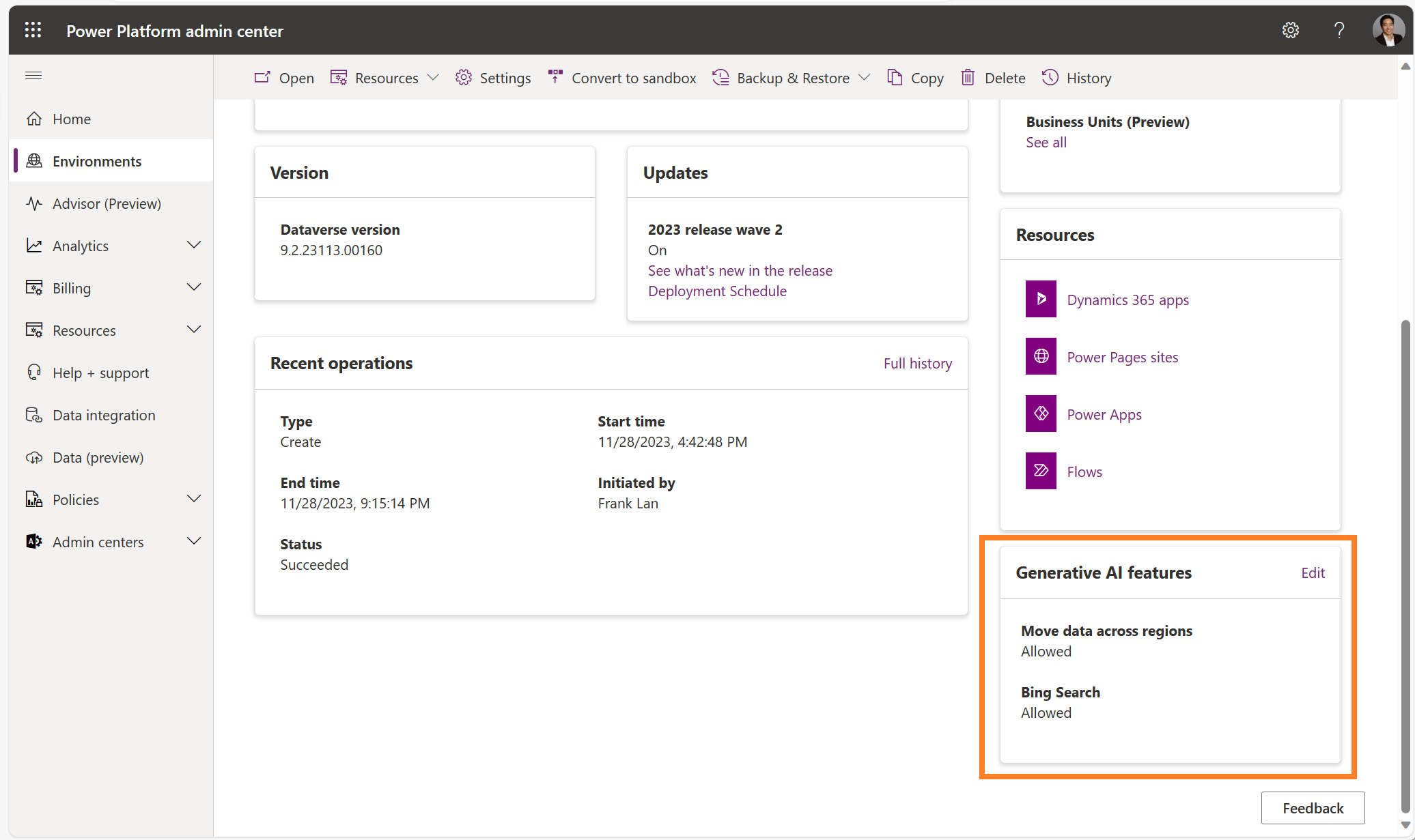 This can be found under Environments > [Your Environment] > Generative AI features